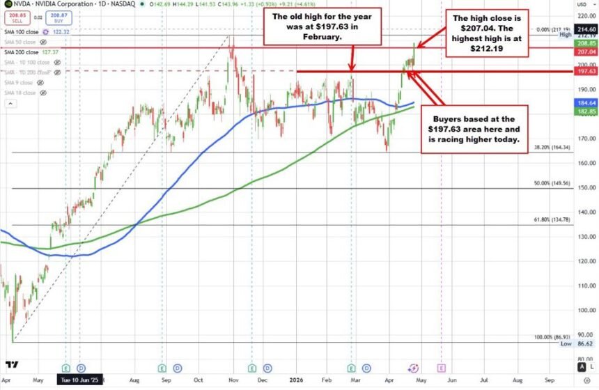Shares of Nvidia have just spiked up to a high of $208.88. That took the price up by over $9 or 4.5% on the day. The price also moved above…