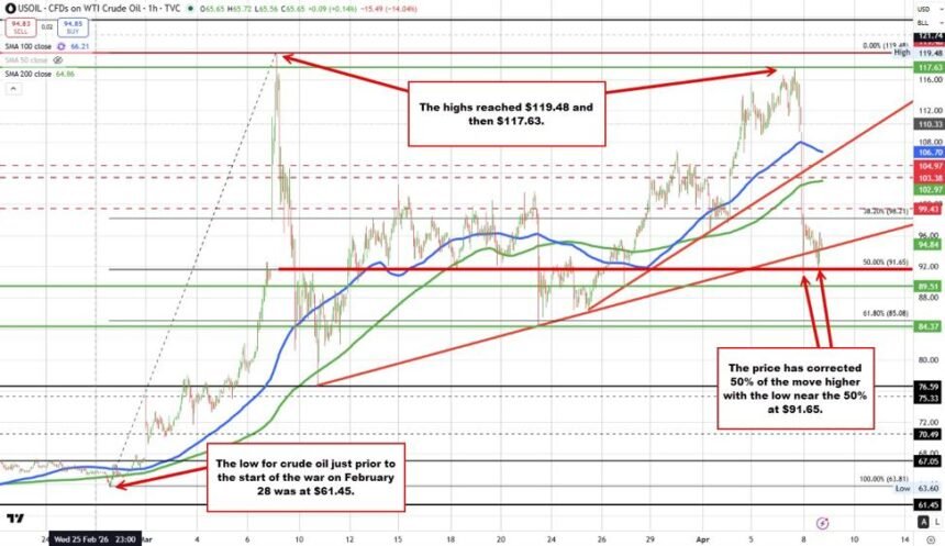 Crude oil prices are down sharply today with the front contract trading at $94.40. That is down 16.43%. The low for the day reached $91.05. The high was $109.19. The…