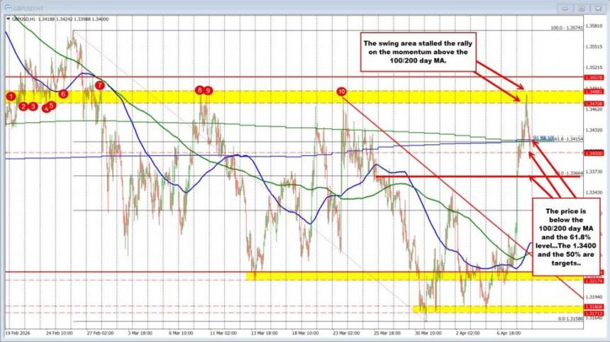 The GBPUSD has rotated back below a key cluster of technical levels, including the tight confluence of the 100- and 200-day moving averages near 1.3417, along with the 61.8% retracement…