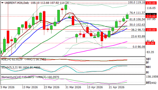 Bulls broke above $110.00 (psychological) and dented $111.37 (Fibo 76.4% of $119.19/$86.08 bear-leg) that brings key barriers at 120 zone (recent peaks) in focus, with limited correction seen as positioning for fresh push higher if geopolitical situation remains unchanged or worsens.